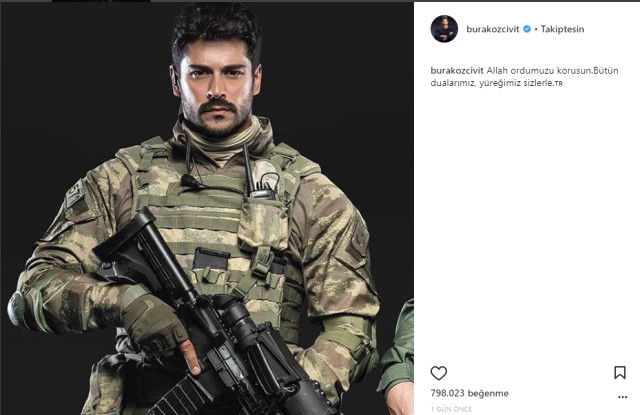 Burak Özçivit sosyal medya hesabından ” Zeytin dalı harekatı” ile ilgili paylaşımda bulundu. Can Feda aldı projesinde bir askeri canlandıran Burak Özçivit, Instagram hesabından yer aldığı projeden çekilmiş asker üniformalı bir fotoğrafını paylaşarak “Allah ordumuzu korusun.Bütün dualarımız, yüreğimiz sizlerle.” yazdı. Ünlü oyuncunun bu paylaşımı 700 binden fazla beğeni aldı.