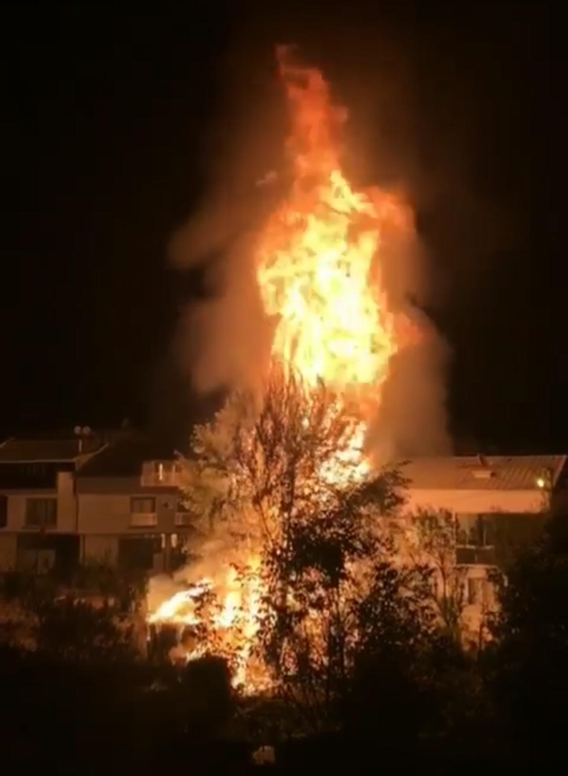 Ağaçların tutuşmasıyla alevler yükselirken, ihbar üzerine olay yerine çok sayıda itfaiye ekibi sevk edildi. İtfaiye ekiplerinin hızlı müdahalesiyle yangın söndürülürken, yangının boyutu kameraya yansıdı.