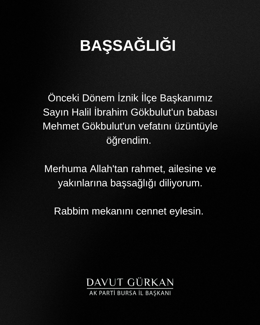 Gürkan, paylaşımında şu ifadelere yer verdi: “Önceki Dönem İznik İlçe Başkanımız Sayın Halil İbrahim Gökbulut’un babası Mehmet Gökbulut’un vefatını üzüntüyle öğrendim. Merhuma Allah’tan rahmet, ailesine ve yakınlarına başsağlığı diliyorum. Rabbim mekânını cennet eylesin.”