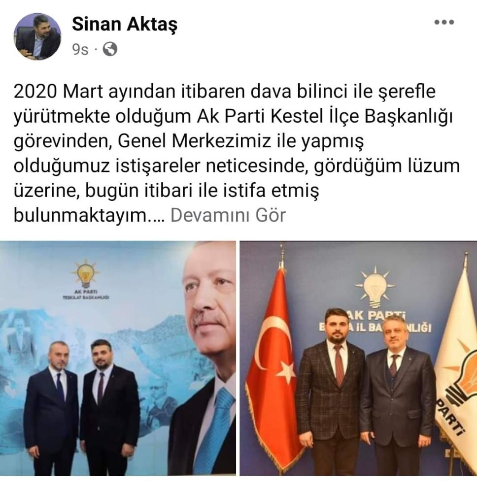 Bursa’da AK parti Kestel ilçe başkanı Sinan Aktaş sosyal medya hesabından yaptığı paylaşımla genel merkezin isteği doğrultusunda görevinden istifa ettiğini açıkladı.