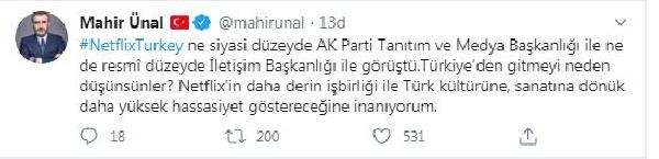 “Netflix Turkey ne siyasi düzeyde AK Parti Tanıtım ve Medya Başkanlığı ile ne de resmi düzeyde İletişim Başkanlığı ile görüştü. Türkiye’den gitmeyi neden düşünsünler? Netflix’in daha derin işbirliği ile Türk kültürüne, sanatına dönük daha yüksek hassasiyet göstereceğine inanıyorum”