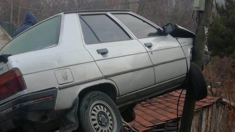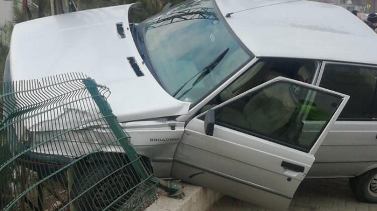 Otomobil, yol kenarındaki demir korkuluğu aşıp, beton istinat duvarı yanındaki ahşap telefon direğine çarparak durdu. 5 metre yükseklikteki duvarda asılı kalan otomobilin sürücüsü İnan, kazayı yara almadan atlattı.