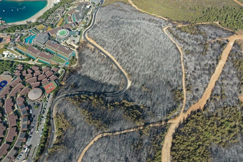 Muğla’nın Milas ilçesinde çıkan orman yangınında zarar gören ormanlık alan havadan görüntülendi.