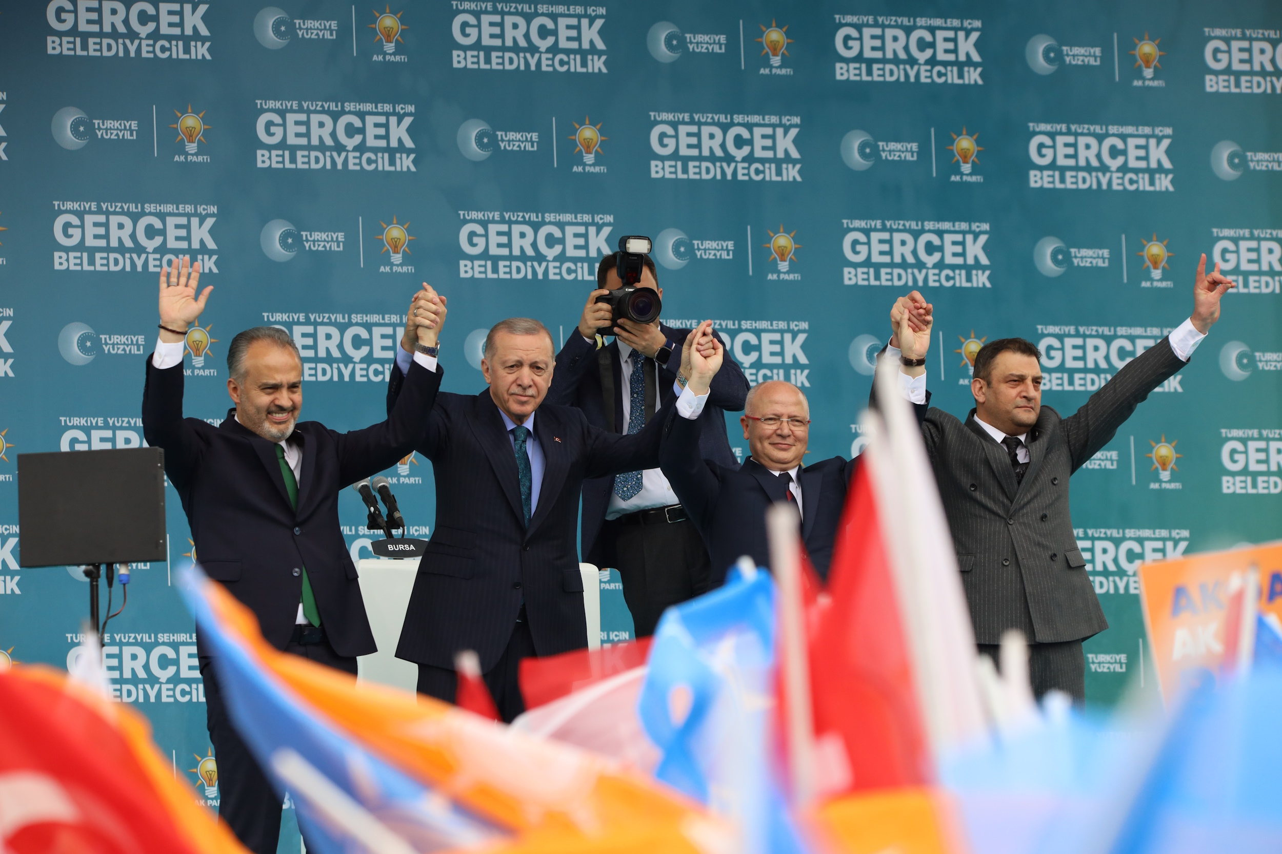 Bursa’nın sanayi ve tarım üretiminin gücüyle dünyaya nam saldığı gibi kendilerini de ekonomide ve diplomaside aynı kucaklayıcılığı sergilediklerini ifade eden Cumhurbaşkanı Erdoğan, 14-28 Mayıs seçimlerinde Cumhur İttifakında milletvekilliğinde yüzde 52, Cumhurbaşkanlığında yüzde 55 destek için Bursalılara teşekkür etti. Bursa türküsündeki, ‘Ak buğdayım buğdayım, sereyim gurudayım, senin güzel dilini, ben nasıl unutayım’ dizelerini okuyan Cumhurbaşkanı Erdoğan, “Biz de Bursa’nın bunca bizden esirgemediği ahde vefasını, kadirşinaslığını, muhabbetini asla unutmayacağız. Her gelişimizde kalbimizin bir köşesini Bursa’da bırakıyoruz. Sordum. Bugün Bursa’da katılım ne durumda diye? Rakamı aldım. 90 bin kişiyiz. Durmak yok, yola devam. Pazar günü inşallah sandıkları gümbür gümbür patlatıyoruz. Şimdi buradan Bursa’yla birlikte Türkiye yüzyılına hazırlanıyoruz. Türkiye yüzyılı şehirlerimizin inşasını Bursa’nın yol arkadaşlığında yapmak istiyoruz. Biz biliyoruz ki Bursa’nın boş lafla, palavrayla, yalanla, dolanla işi olmaz. Çünkü Bursa emeğin, alın terinin, üretimin şehridir. Bursa yatırıma bakar, esere bakar, hizmete bakar, projeye bakar, velhasıl Bursa icraata bakar. Dolayısıyla Türkiye yüzyılı yolculuğumuzda bizi en iyi anlayacak olan Bursa’dır” dedi.