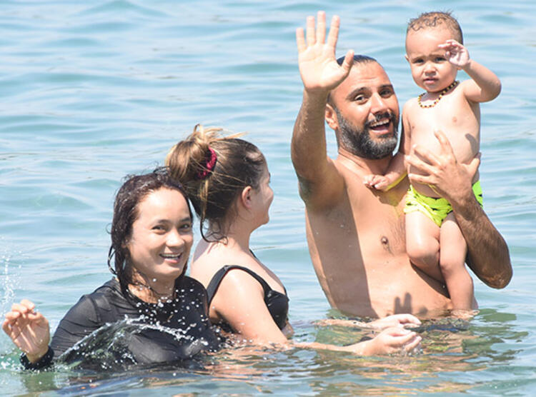 Buse Varol, yazlık alışverişini tamamladıktan sonra eşi ve oğlunun yanına gitti ve akşam üzeri denize girdi.