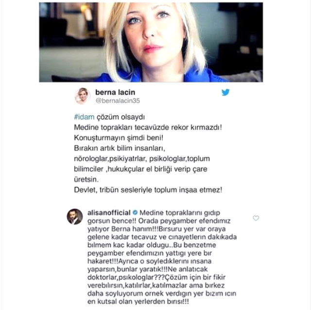 Son zamanlarda gündemde olan idam tartışmalarına Berna Laçin” İdam çözüm olsaydı. Medine toprakları tecavüzde rekor kırmazdı! Konuşturmayın şimdi beni! Bırakın artık bilim insanları, nörologlar, psikiyatrlar, psikologlar, toplum bilimcileri, hukukçular el birliği verip çare üretsin. Devlet, tribün sesleriyle toplum inşaa etmez!” sözleriyle dahil olmuştu.
