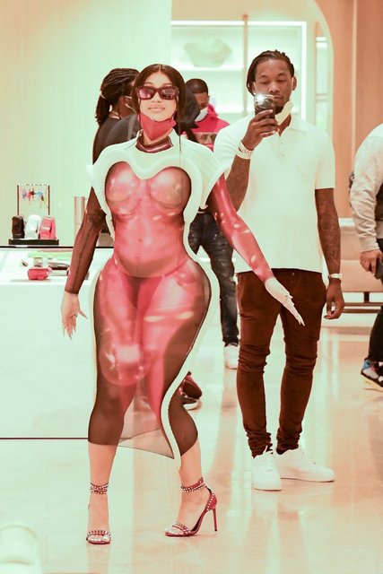 Üst kısmı kazak gibi görünen, şeffaf bir tulum izlenimi uyandıran elbisesiyle meraklı bakışları üzerinde toplayan Cardi B., kıyafetine uygun renkte de bir maske tercih etti.