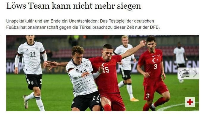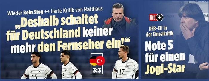 Alman basını Löw’ü eleştirirken Bild maçla ilgili haberinde, “Almanya’da kimse bu yüzden televizyonu açmıyor. 2020 yılında üçüncü maçta da benzer bir son. Alman Milli Takımı, korona sonrası ilk zaferini bekliyor” ifadelerine yer verdi.