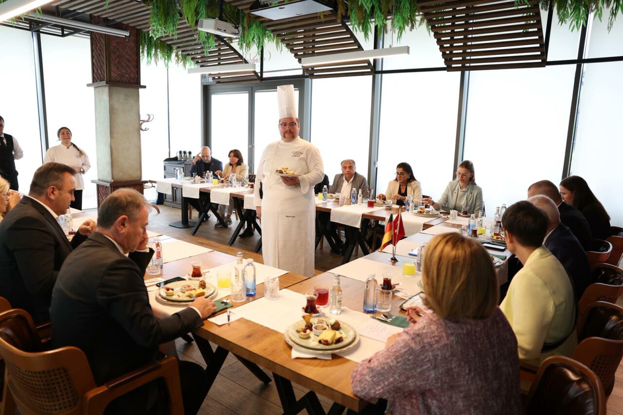 Konuşmaların ardından Bursa’nın ünlü şeflerinden Ali Müfit Çağlayan tarafından hazırlanan Bursa’ya özgü tatlar, misafirlere ikram edildi. Kullanılan ürünler ve hikayeleri hakkında konuklara bilgiler verildi. Sunulan yemekleri büyük beğeniyle yiyen yabancı konuklar, Başkan Mustafa Bozbey’e ve Şef Ali Müfit Çağlayan’a teşekkür etti. Başkan Bozbey, Alman heyeti 26-27-28 Eylül tarihlerinde yapılacak Bursa Gastronomi Festivali’ne davet etti.