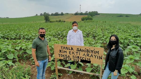 Almanya’da tatil için memleketi Bursa’nın İnegöl ilçesine gelen Ahmet Y., burada kendisine ait tarlaya ayçiçeği ekildiğini gördü. Şoke olan Ahmet Y., yaptığı araştırmada tarlasını eken kişiye ulaşamadı. Ahmet Y., ‘Tarla sahibiyim. Kim ekti, arayın. Yoksa sürecem’ yazılı tabela yaptırıp tarlaya dikti. Tabelaya telefon numarasını da ekleyen Ahmet Y., izinsiz ekim yapan kişinin aramasını bekliyor. Tabelayı görenler ise şaşkınlığını gizleyemiyor.