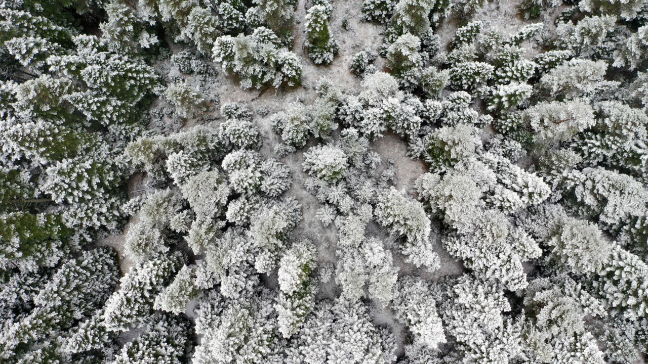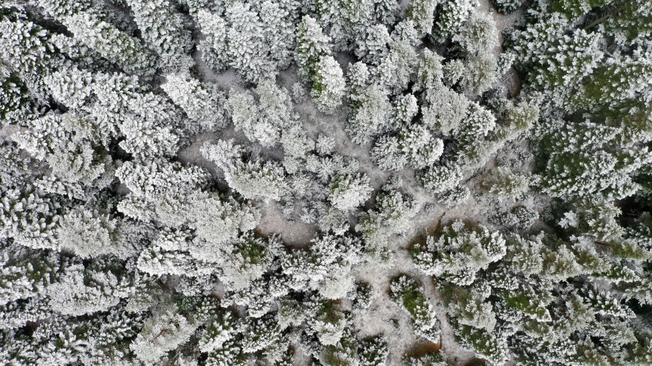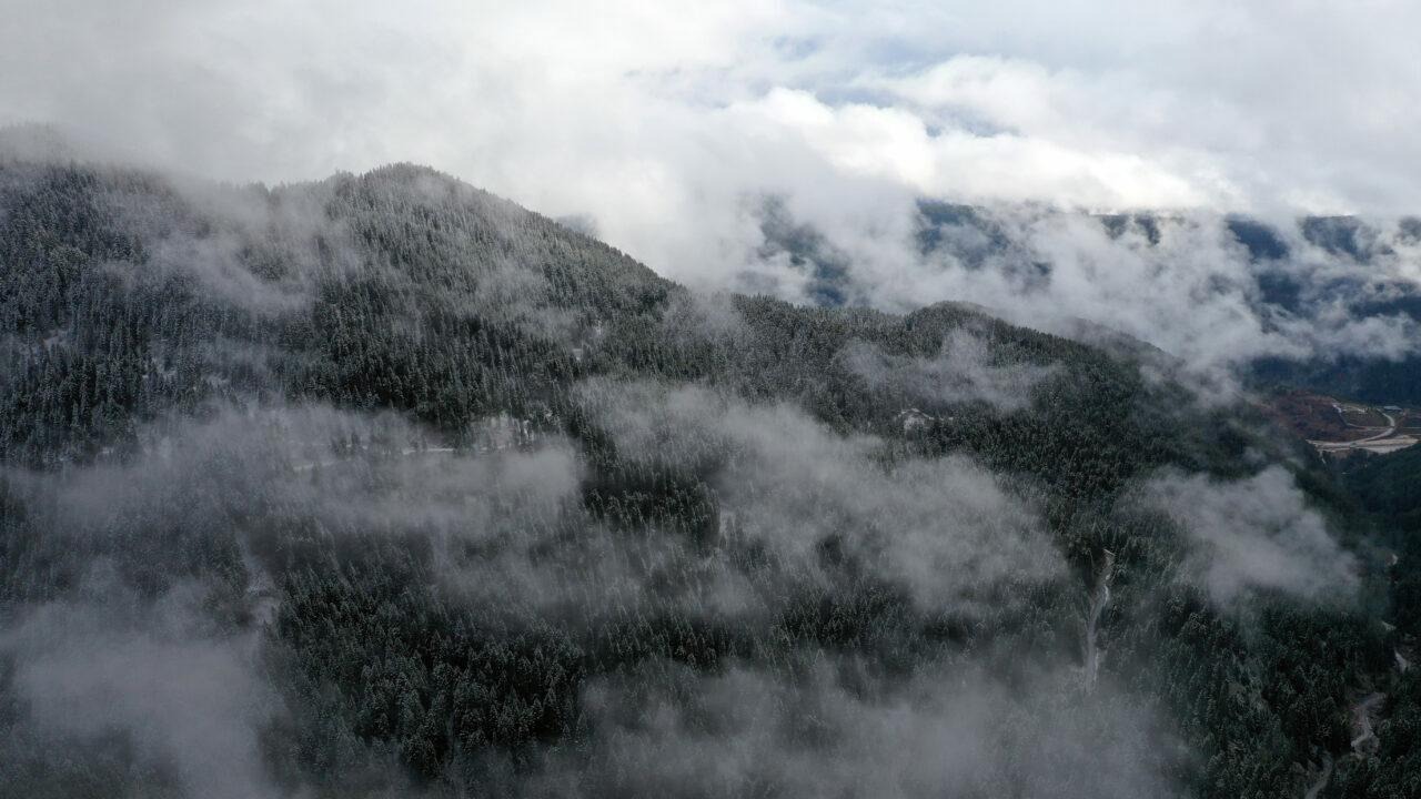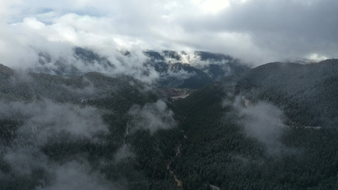 Güzel görüntü oluşturan ormandaki kar ve sis, drone ile havadan görüntülendi.