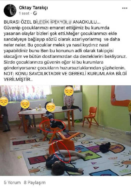 Bilecik’te oturan İnci ve Oktay Tarakçı çiftine, konuşma gecikmesi rahatsızlığı olan 3,5 yaşındaki çocuklarının, özel anaokulunda sandalyeye bağlandıklarını gösteren fotoğraflar ulaştı. Baba Oktay Tarakçı, fotoğrafı sosyal medyadan paylaşarak tepki gösterdi. Tarakçı paylaşımında, “Güvenip çocuklarımızı emanet ettiğimiz bu kurumda yaşanan olaylar bizleri şok etti. Meğer çocuklarımızı iple sandalyeye bağlayıp sözlü olarak azarlıyorlarmış ve daha neler neler. Bu çocuklar melek ya, nasıl kıydınız, nasıl yapabildiniz bunu. Ben bu konunun adli olarak takipçisi olacağım ve bütün dostlarımızdan da desteklerini bekliyoruz. Siz de çocuklarınıza güvenin, eğer ki bu kurumlara gönderiyorsanız, çocukların huzursuzluklarından şüphelenin” dedi.