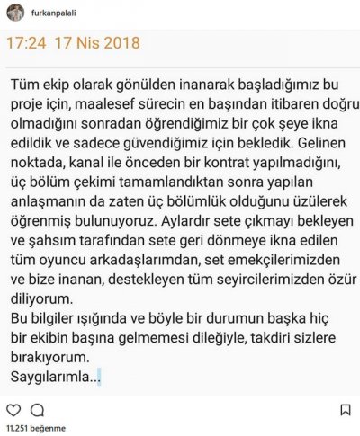 Kararın ardından dizinin başrol oyuncusu Furkan Palalı’dan zehir zemberek bir paylaşım geldi.