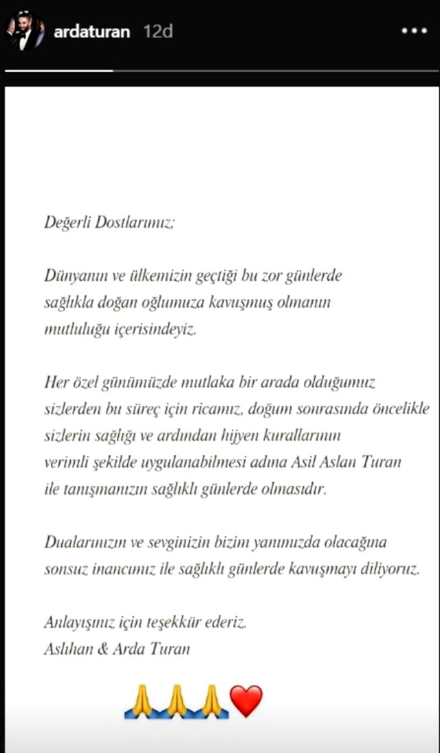 Eşi Aslıhan ile ortak açıklama yapan Turan şu ifadeleri kullandı: “Dünyanın ve ülkemizin geçtiği bu zor günlerde sağlıkla doğan oğlumuza kavuşmuş olmanın mutluluğu içerisindeyiz. Her özel günümüzde mutlaka bir arada olduğumuz sizlerden bu süreç için ricamız; doğum sonrasında öncelikle sizlerin sağlığı ve ardından hijyen kurallarının verimli bir şekilde uygulanabilmesi adına Asil Aslan Turan ile tanışmanızın sağlıklı günlerde olmasıdır. Dualarınızın ve sevginizin bizim yanımızda olacağına sonsuz inancımız ile sağlıklı günlerde kavuşmayı diliyoruz.”