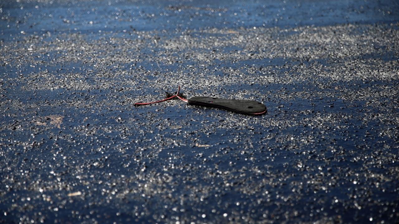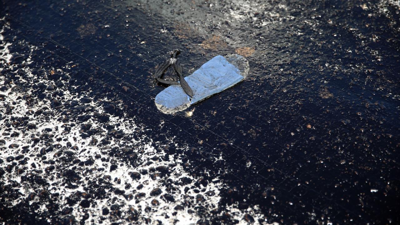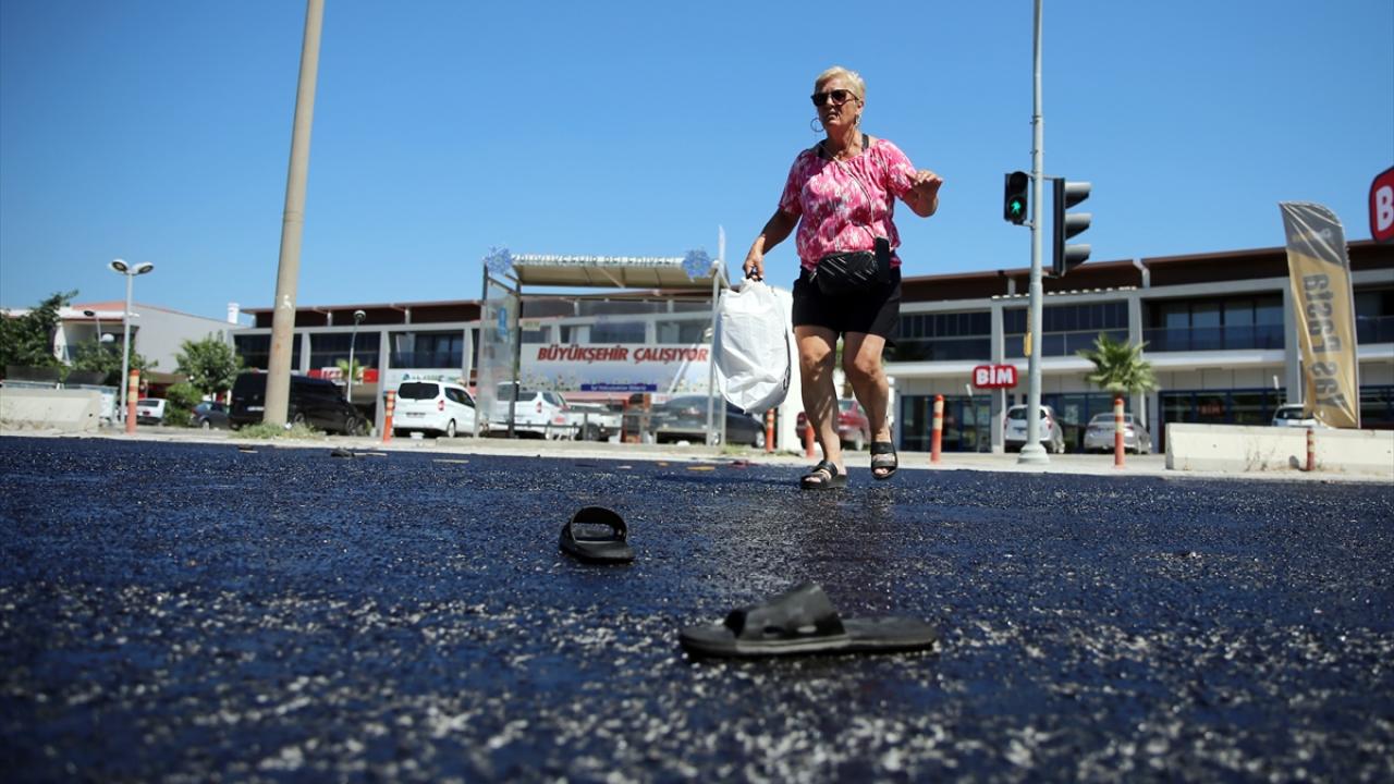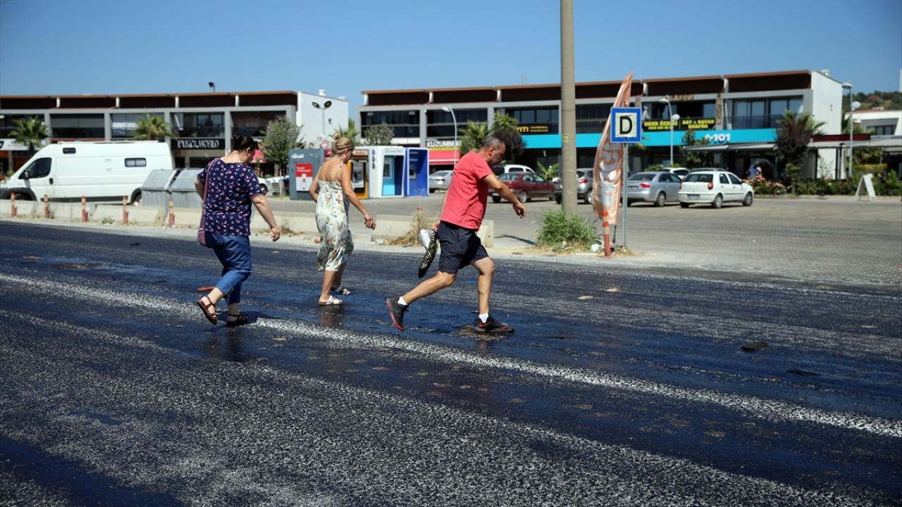 Kuşadası’nda Davutlar yolunda asfalt eridi. Eriyen asfalttan yolun karşısına geçmek isteyen vatandaşlar, zor anlar yaşadı. Bazı vatandaşların terliği, eriyen asfalta yapıştı.