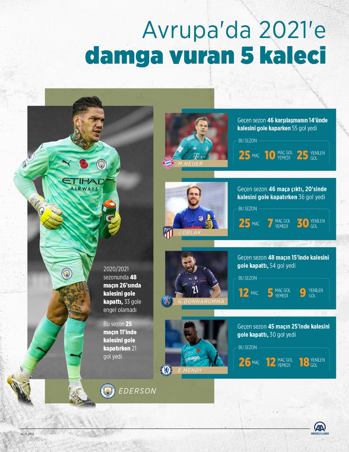 İngiltere Premier Lig takımı Manchester City’in 2020-2021 sezonunda şampiyonluğa ulaşmasında katkısı olan Ederson, ligde forma giydiği 36 maçın 19’unda kalesini gole kapatırken 28 gole engel olamadı.