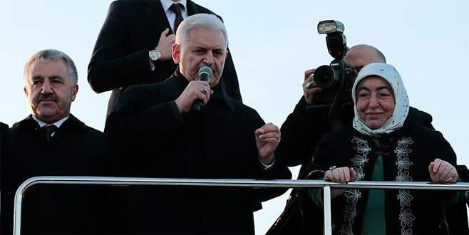 “Bugün Çanakkale tarihi bir gün yaşıyor. Çanakkale Zaferi’nin 102. yıl dönümünü törenle kutladık ama bir şey daha yaptık. Çanakkale Boğazı’na bir inci gerdanlık takacağız. Bugün 1915 Çanakkale Köprüsü’nün temelini de attık. Hayırlı, uğurlu olsun. Muasır medeniyetler seviyesine ulaşacak Türkiye’yi geleceğe hazırlayacak çocuklarımızın, torunlarımızın, mutlu yarınları için 16 Nisan’ı unutmuyoruz. 16 Nisan’da tek vatan, tek millet, tek bayrak, tek devlet için ‘evet’. İşte o Avrupa’dakilere Kandil’dekilere FETÖ’cülere inat evet. İnşallah Türkiye’nin aydınlık yarınlarına kapıları hep beraber açacağız. Türkiye büyük bir devlet. Büyük devlet olduğu nereden belli? Bakın, Avrupalılar seçimlerinde bile Türkiye’yi konuşuyorlar. Türkiye sadece kendi geleceğine değil Avrupalıların seçimlerine de ayar veriyor. Onların ırkçılık, İslam ve Türk düşmanlığına fren veriyor.”