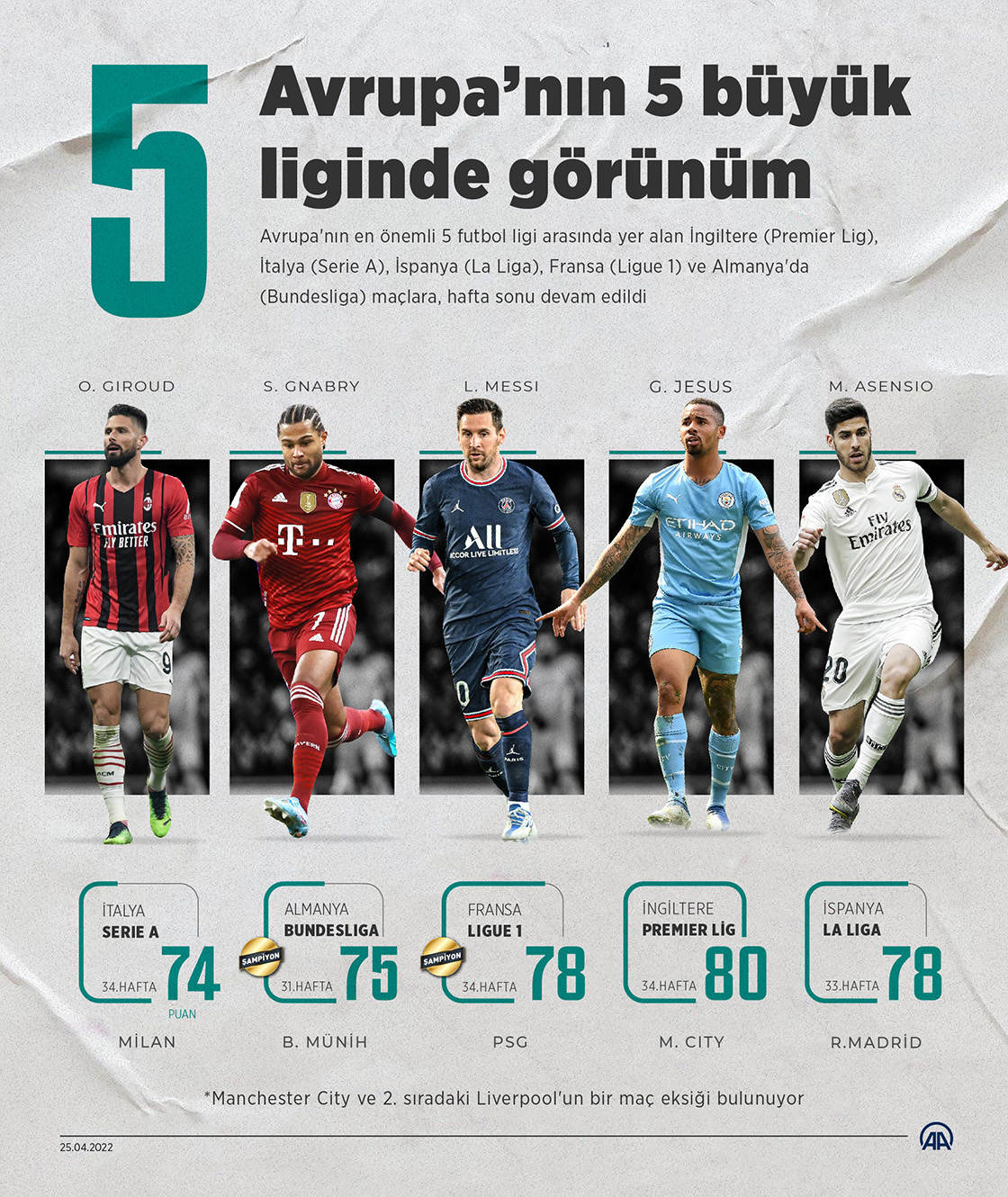 Almanya’da Bayern Münih, Fransa’da da Paris Saint-Germain (PSG) şampiyonluğu garantiledi. İngiltere’de Manchester City, İspanya’da Real Madrid, İtalya’da ise Milan, puan tablosunun zirvesinde yer aldı.