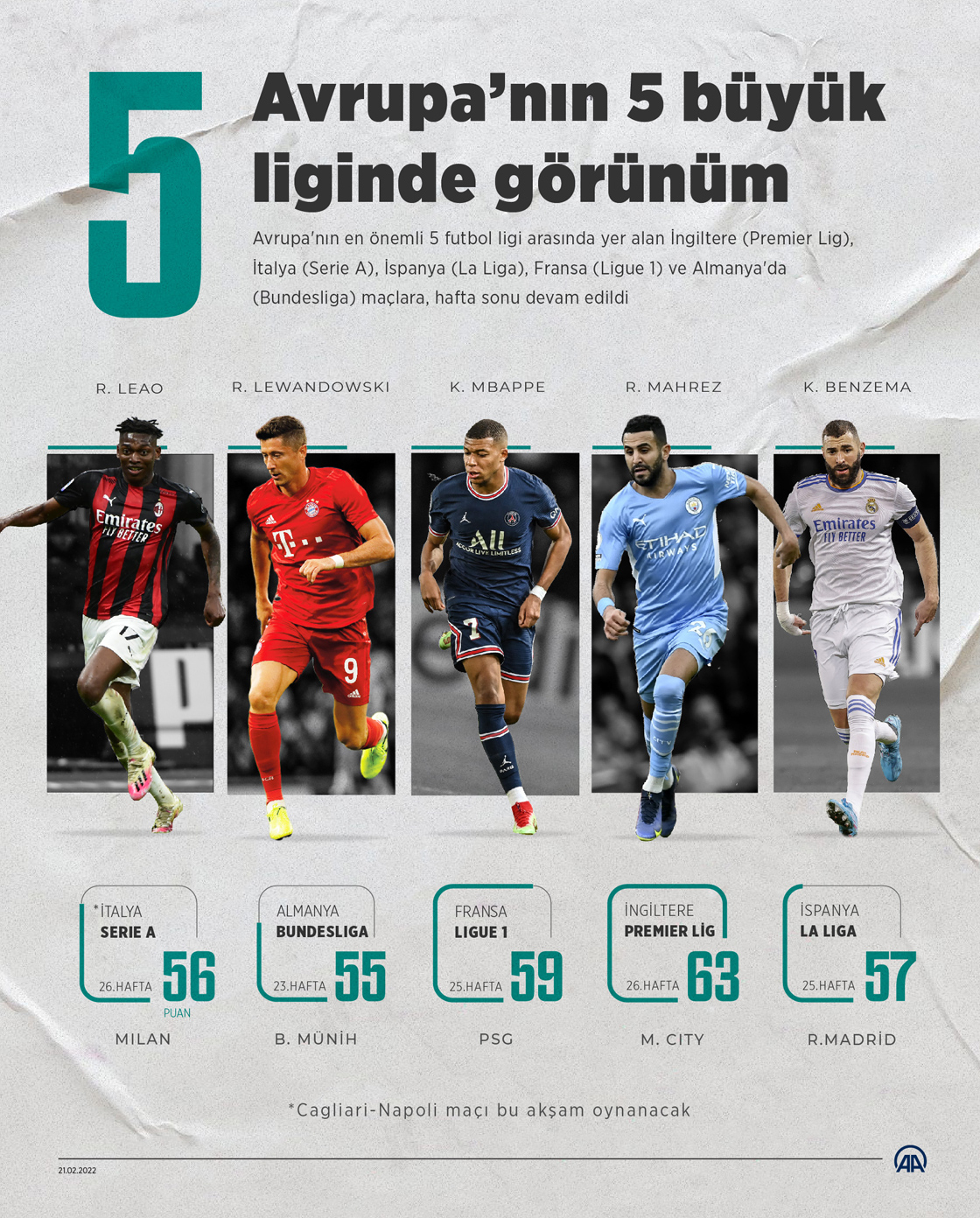Avrupa’nın en büyük 5 futbol ligi kabul edilen İngiltere (Premier Lig), İspanya (La Liga), İtalya (Serie A), Almanya (Bundesliga) ve Fransa’daki (Ligue 1) maçlara, hafta sonu devam edildi.