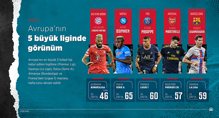 İngiltere’de Arsenal, İspanya’da Barcelona, İtalya’da Napoli, Almanya’da Bayern Münih, Fransa’da ise Paris Saint-Germain (PSG), puan tablosunun zirvesinde yer aldı.