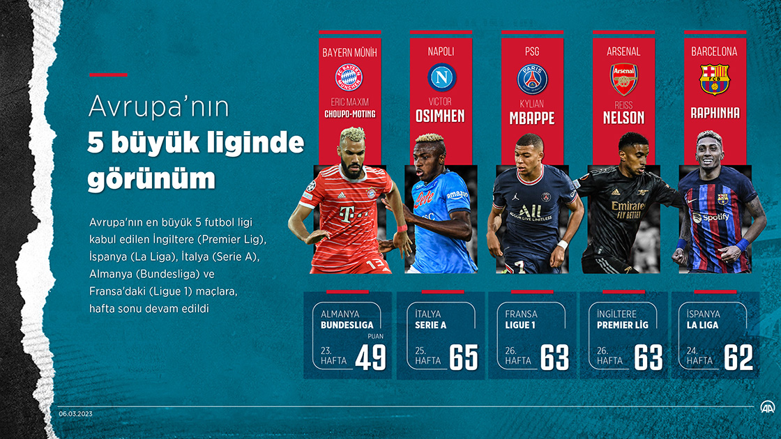 İngiltere’de Arsenal, İspanya’da Barcelona, İtalya’da Napoli, Almanya’da Bayern Münih, Fransa’da ise Paris Saint-Germain (PSG), puan tablosunun zirvesinde yer aldı.