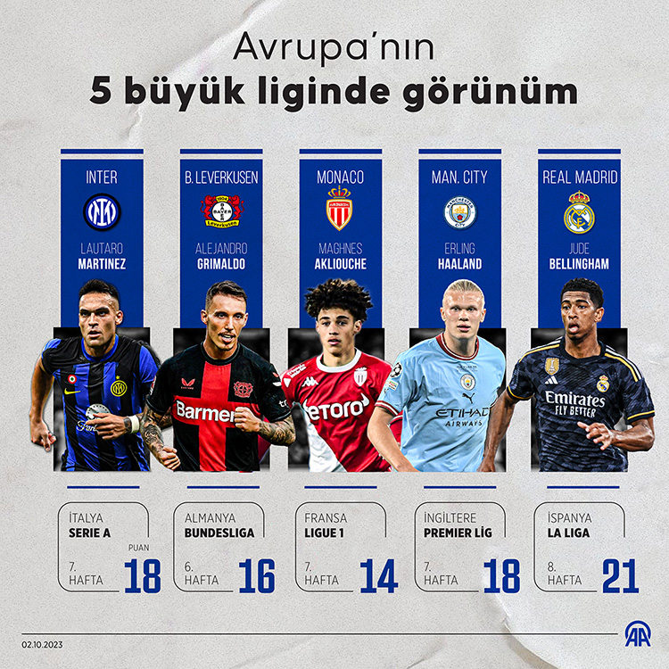 İngiltere’de Manchester City, İspanya’da Real Madrid, İtalya’da Inter, Almanya’da Bayer Leverkusen, Fransa’da ise Monaco, puan tablosunun zirvesinde yer aldı.