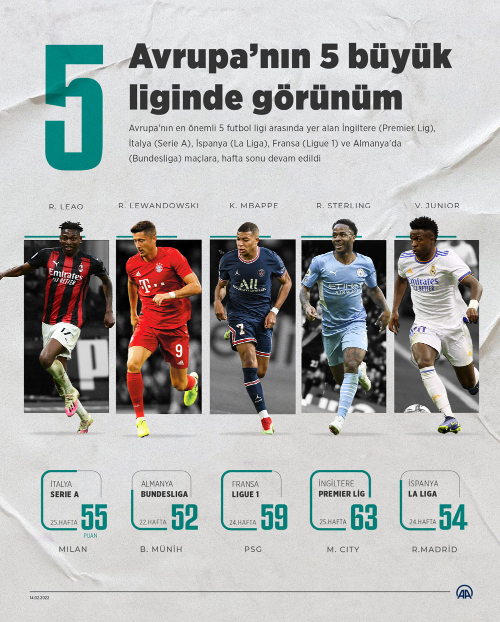 İngiltere’de Manchester City, İspanya’da Real Madrid, İtalya’da Milan, Almanya’da Bayern Münih, Fransa’da ise Paris Saint-Germain (PSG), puan tablosunun zirvesinde yer aldı.