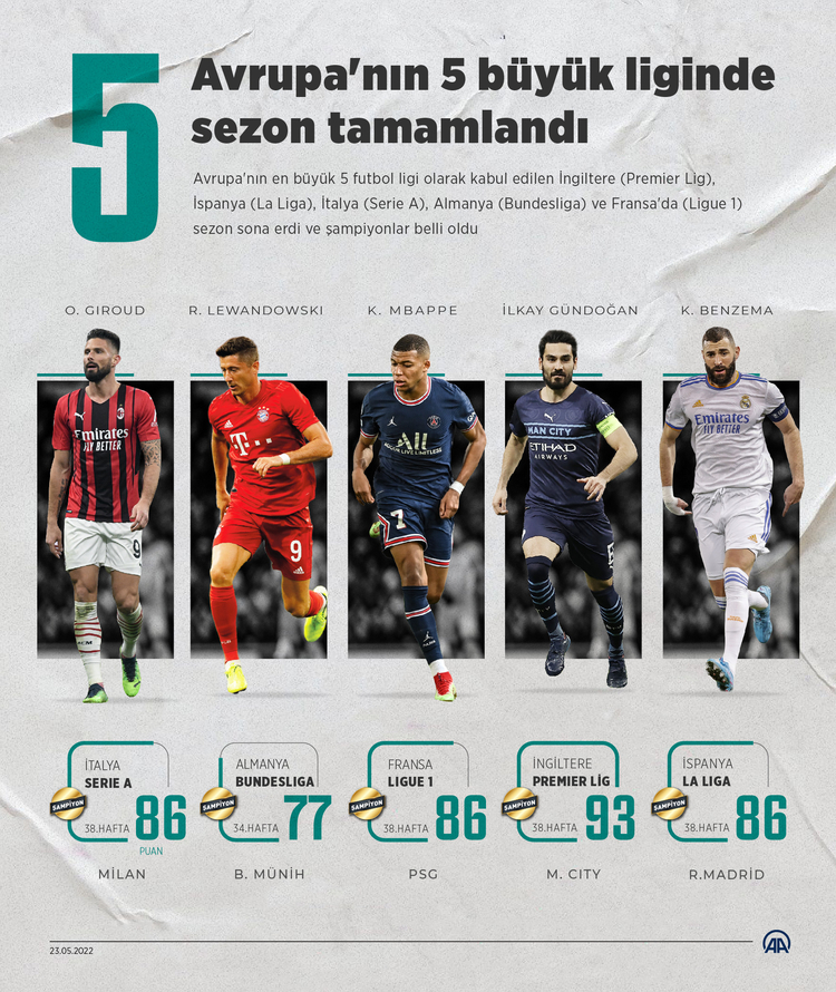 Avrupa’nın en büyük 5 futbol ligi olarak kabul edilen İngiltere (Premier Lig), İspanya (La Liga), İtalya (Serie A), Almanya (Bundesliga) ve Fransa’da (Ligue 1) sezon sona erdi ve şampiyonlar belli oldu.