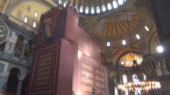 Bu defa iç duvarların onarımı için kurulan iskeleler, proje süresi 650 gün olmasına rağmen 2013’ten bu yana Ayasofya’da varlığını sürdürüyordu. İskelenin sökülmesi için, camide çalışmalar başladı. İşçiler iskeleyi üst kısımdan başlayarak yavaş yavaş söküyor.