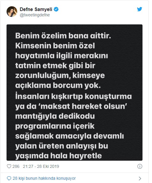 Defne Samyeli, Twitter hesabından açıklama yaptı. Samyeli, çıkan iddialar karşısında şu ifadeleri kullandı: