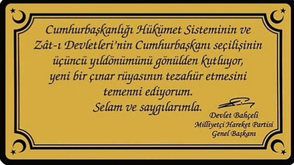Bahçeli, fidanı, “Cumhurbaşkanlığı Hükümet Sistemi’nin ve Zat’ı Devletleri’nin Cumhurbaşkanı seçilişinin üçüncü yıl dönümünü gönülden kutluyor, yeni bir çınar rüyasının tezahür etmesini temenni ediyorum.” mesajıyla Erdoğan’a gönderdi.