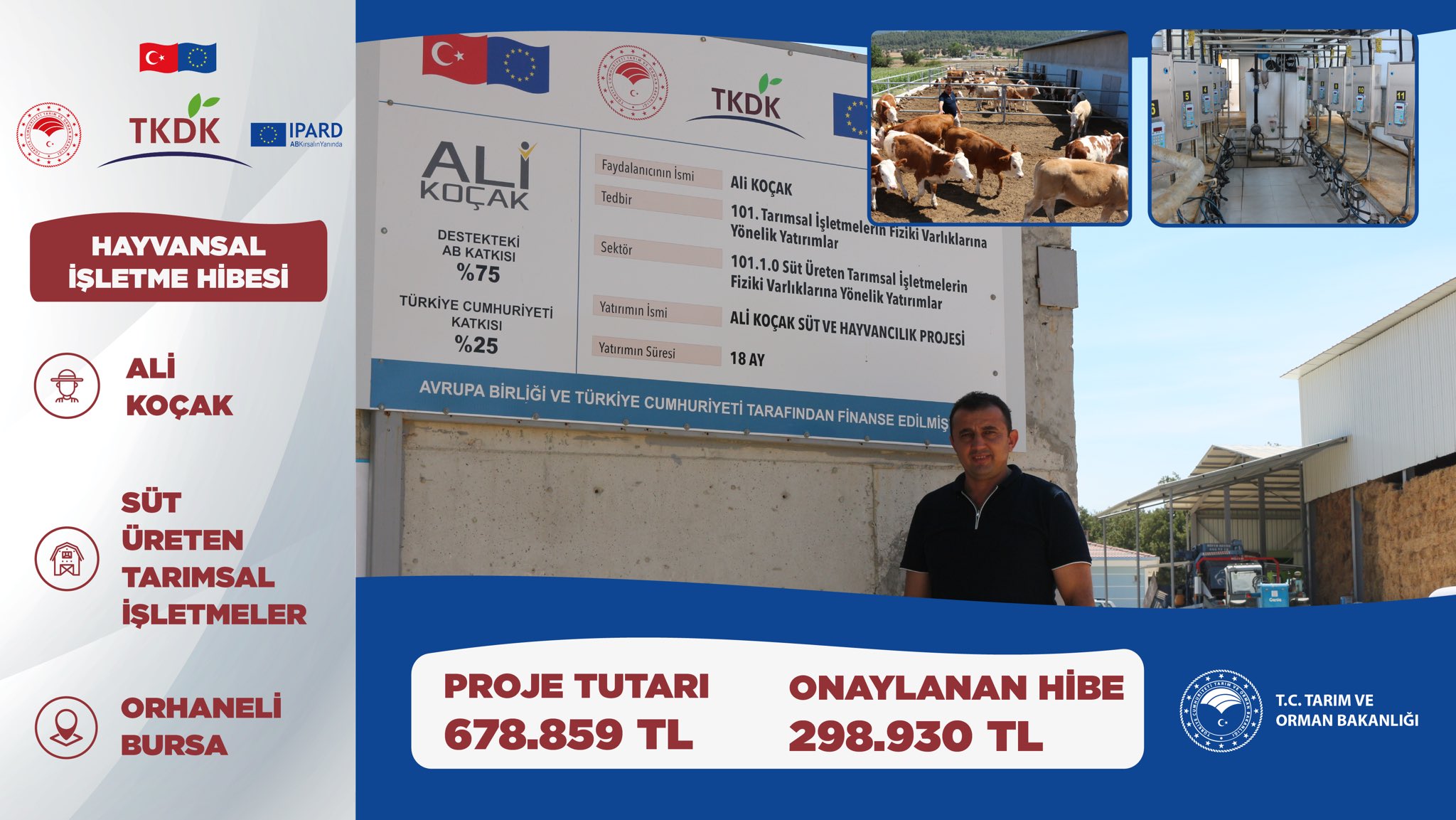 Bursa’dan Ali Koçak’ın Süt Üreten Tarımsal İşletmesine TKDK aracılığıyla 298 bin lira hibe sağladık. Destek bizden, üretmek sizden.