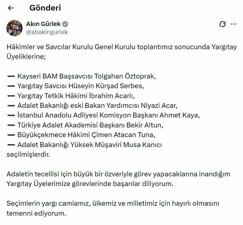 Adalet Bakanı Akın Gürlek, sanal medya hesabından yaptığı açıklamada, “Hakimler ve Savcılar Kurulu Genel Kurulu toplantımız sonucunda Yargıtay üyeliklerine; Kayseri Bölge Adliye Mahkemesi Başsavcısı Tolgahan Öztoprak, Yargıtay Savcısı Hüseyin Kürşad Serbes, Yargıtay Tetkik Hakimi İbrahim Acarlı, eski Adalet Bakanlığı Bakan Yardımcısı Niyazi Acar, İstanbul Anadolu Adliyesi Komisyon Başkanı Ahmet Kaya, Türkiye Adalet Akademisi Başkanı Bekir Altun, Büyükçekmece Hakimi Çimen Atacan Tuna, Adalet Bakanlığı Yüksek Müşaviri Musa Kanıcı seçilmişlerdir. Adaletin tecellisi için büyük bir özveriyle görev yapacaklarına inandığım Yargıtay üyelerimize görevlerinde başarılar diliyorum. Seçimlerin yargı camiamız, ülkemiz ve milletimiz için hayırlı olmasını temenni ediyorum” dedi. (DHA)