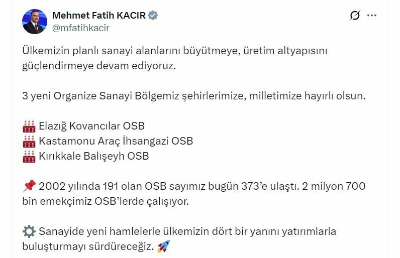 Bakan Kacır, sanal medya hesabından yapılan açıklamada, “Ülkemizin planlı sanayi alanlarını büyütmeye, üretim altyapısını güçlendirmeye devam ediyoruz. 3 yeni organize sanayi bölgemiz şehirlerimize, milletimize hayırlı olsun; Elazığ Kovancılar OSB, Kastamonu Araç İhsangazi OSB, Kırıkkale Balışeyh OSB. 2002 yılında 191 olan OSB sayımız bugün 373’e ulaştı. 2 milyon 700 bin emekçimiz OSB’lerde çalışıyor. Sanayide yeni hamlelerle ülkemizin dört bir yanını yatırımlarla buluşturmayı sürdüreceğiz” ifadelerini kullandı. (DHA)