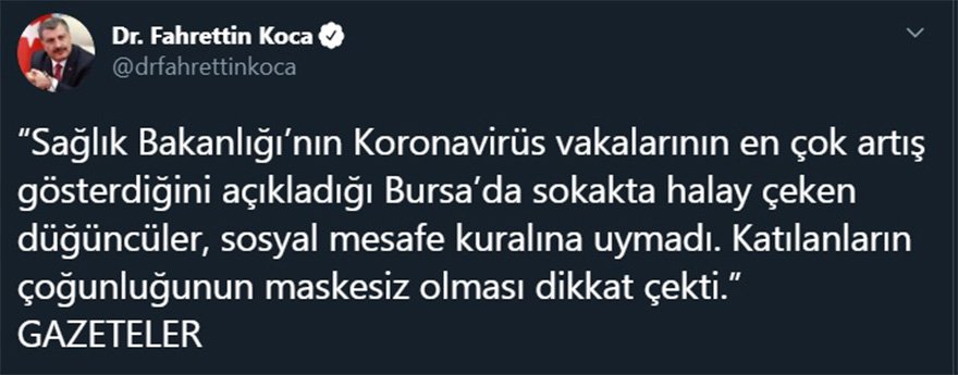 Sağlık Bakanı Fahrettin Koca, sosyal medya hesabından yaptığı paylaşımda, önceki gün Bursa’da yapılan bir sokak düğününde sosyal mesafe ve maske kuralının hiçe sayılmasının kaygı verici olduğunu belirtmiş, kentteki vaka sayılarındaki artışa dikkati çekmişti.