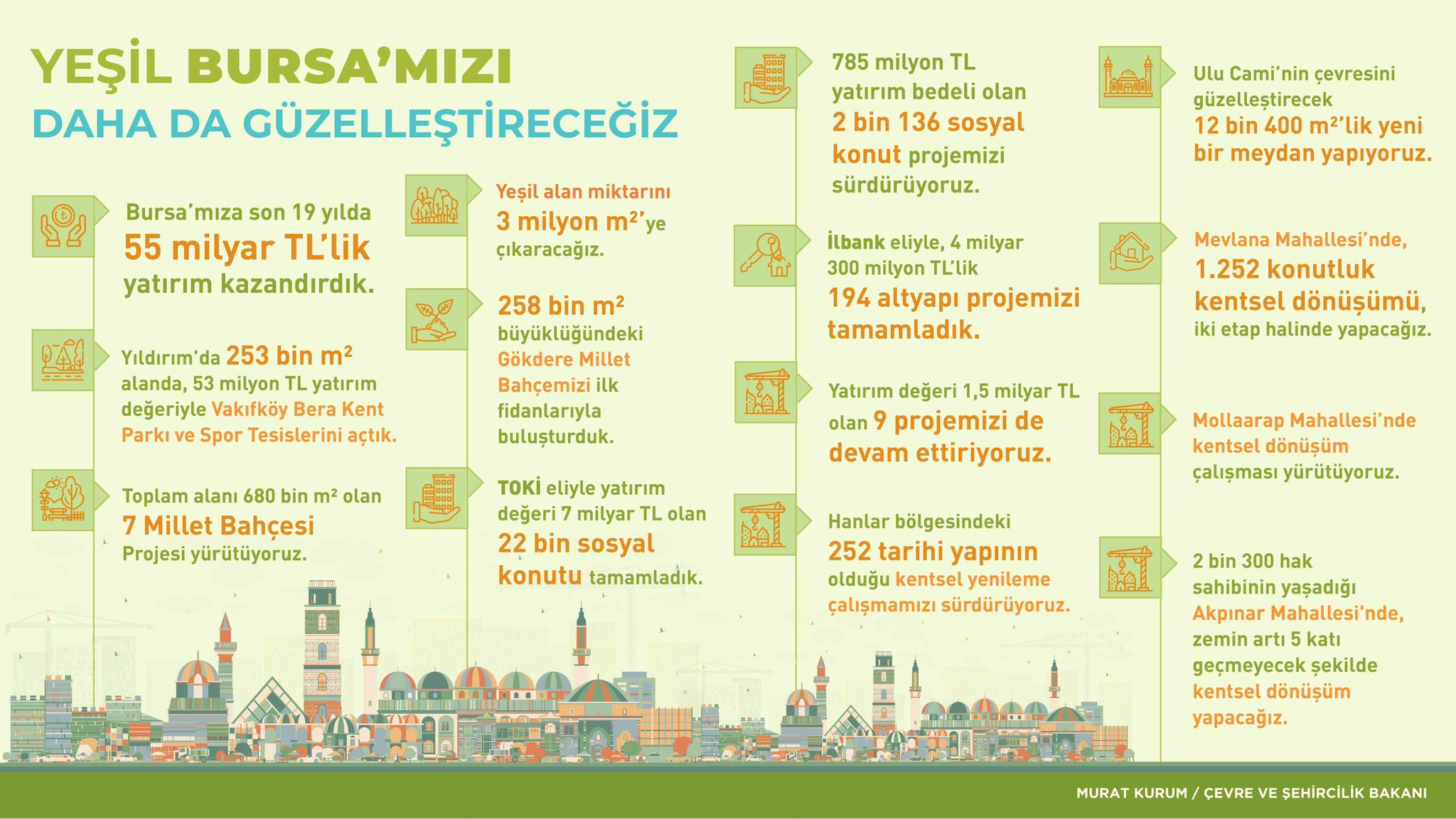 Bursa’da gün boyu bir dizi açılış ve temel tma törenine katılan Çevre ve Şehircilik Bakanı Murat Kurum, sosyal medya hesabından bir tablo paylaşarak yapılan yatırımları tanıttı.