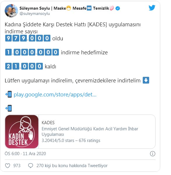 Bakan Soylu, Twitter hesabından yaptığı açıklamada, “KADES uygulamasını indirme sayısı 979 bin oldu.