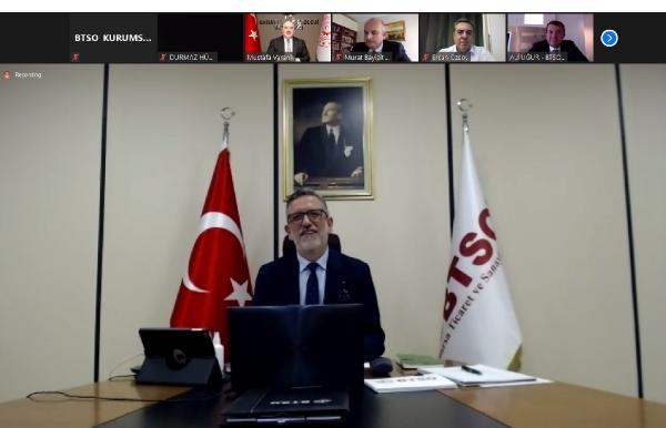 Bursa Ticaret ve Sanayi Odası’nın (BTSO) 63 meslek komitesinin temsilcilerinin katıldığı Müşterek Meslek Komiteleri Toplantısı, Mayıs Ayı Olağan Meclis Toplantısı’nın ardından yapıldı. Video konferans yöntemiyle gerçekleştirilen toplantıda, Bursalı iş insanları, Covid-19 salgınının sanayi ve ticaret hayatına etkilerine ilişkin görüş ve önerilerini, Sanayi ve Teknoloji Bakanı Mustafa Varank’a aktardı.