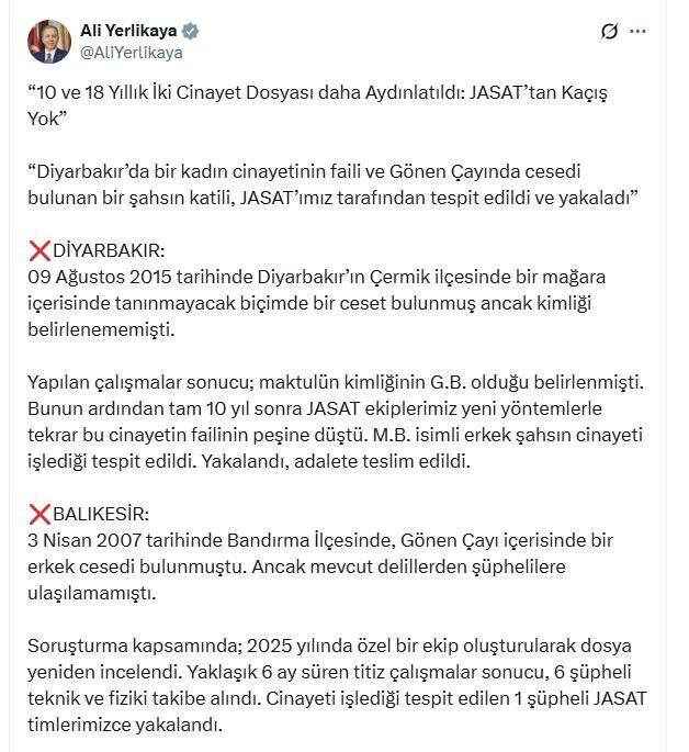 İçişleri Bakanı Ali Yerlikaya, JASAT tarafından yapılan çalışmaları sosyal medya hesabından paylaştı. Buna göre; 9 Ağustos 2015’te Diyarbakır’ın Çermik ilçesinde bir mağara içerisinde tanınmayacak biçimde bir ceset bulundu. Yapılan çalışmalar sonucu maktulün kimliğinin G.B. olduğu belirlendi. Olaydan 10 yıl sonra JASAT ekipleri yeni yöntemlerle failin peşine düştü. M.B. isimli erkek şüphelinin cinayeti işlediği tespit edildi. Yakalanan şüpheli, adalete teslim edildi.