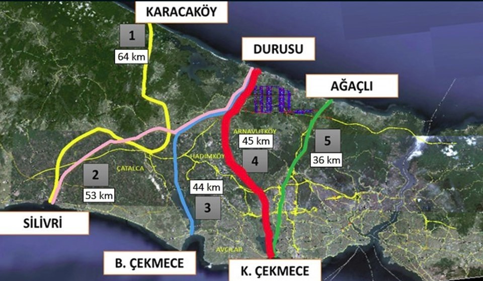 Kanalın yapılmasına karar verdikten sonra güzergahları tespit ettik. İnşa edilebilecek 5 adet güzergah var. Arazi ve sahada araştırıldı ve incelendi. Alternatif güzergahlar ve birbirleriyle mukayesesi… Bunların en az maliyetlisi, çevreye en az zararlı olanı araştırılıp Küçükçekmece-Durusu koridoruna karar verdik. Küçükçekmece-Ağaçlı hattı kısa olmasına rağmen su ve orman alanlarına zararı nedeniyle vazgeçildi. Maliyeti ve işletme ücretlerinin daha az olmasına rağmen tercih edilmedi. Onun için bu güzergah değil de Küçükçekmece-Durusu güzergahına karar verildi. Diğer alternatiflerin su kaynaklarına etkisi daha fazla.