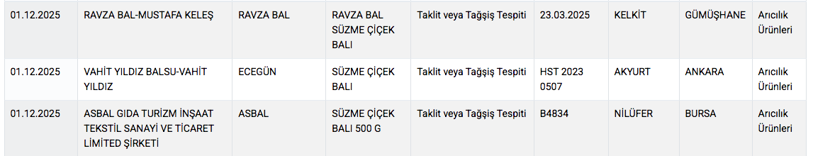 Sitede yer alan bilgilere göre; bu 3 firma arasında merkezi Bursa’nın Nilüfer ilçesinde bulunan Asbal Gıda Turizm İnşaat Tekstil Sanayi ve Ticaret Ltd. Şti. de yer alıyor. Şirketin Asbal markasıyla sattığı süzme çiçek balında taklit veya tağşiş yaptığı belirlendi.