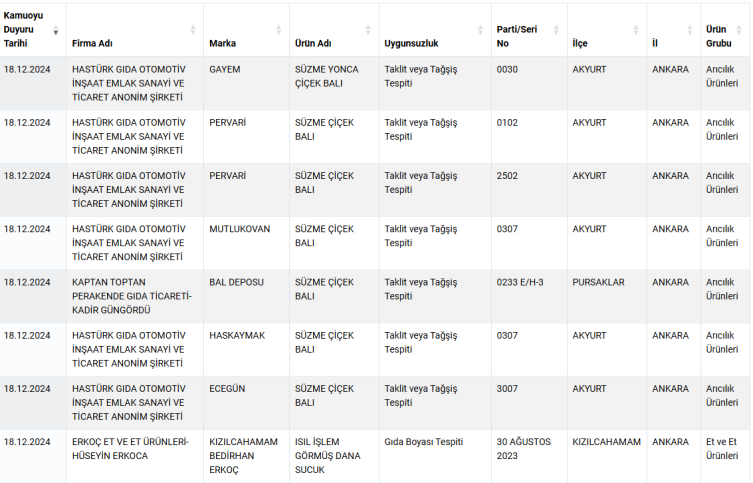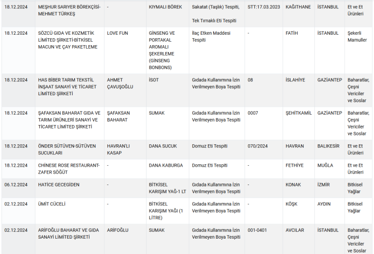 Listede birçok zeytinyağı, bal markası yer aldı. Bir kasap ve bir restoranda satılan bazı ürünlerde ise domuz eti tespit edildiği belirtildi.