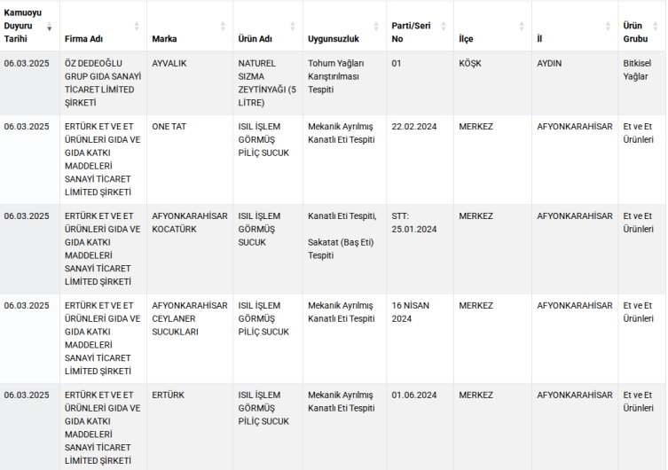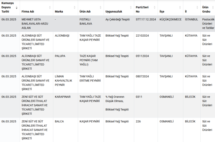 Listedeki ürünlerde, fıstıklı baklavada ay çekirdeği, sucukta mekanik ayrılmış kanatlı eti ve sakatat (baş eti), kaşar peynirinde bitkisel yağ, zeytinyağında ise tohum yağ tespiti gibi birçok uygunsuzluk yer alıyor.