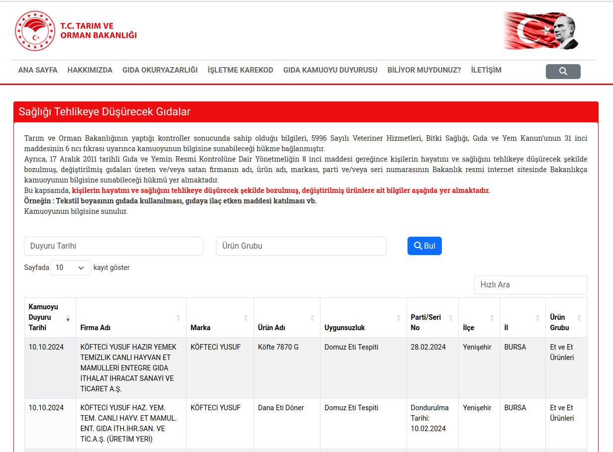 Güncellenen listeye, son günlerde ürünlerinde domuz eti kullanıldığı iddialarıyla gündeme gelen ve kamuoyunda “Köfteci Yusuf” olarak bilinen “Köfteci Yusuf Hazır Yemek Temizlik Canlı Hayvan Et Mamulleri Entegre Gıda İthalat İhracat Sanayi ve Ticaret AŞ” adlı işletme dahil edildi.