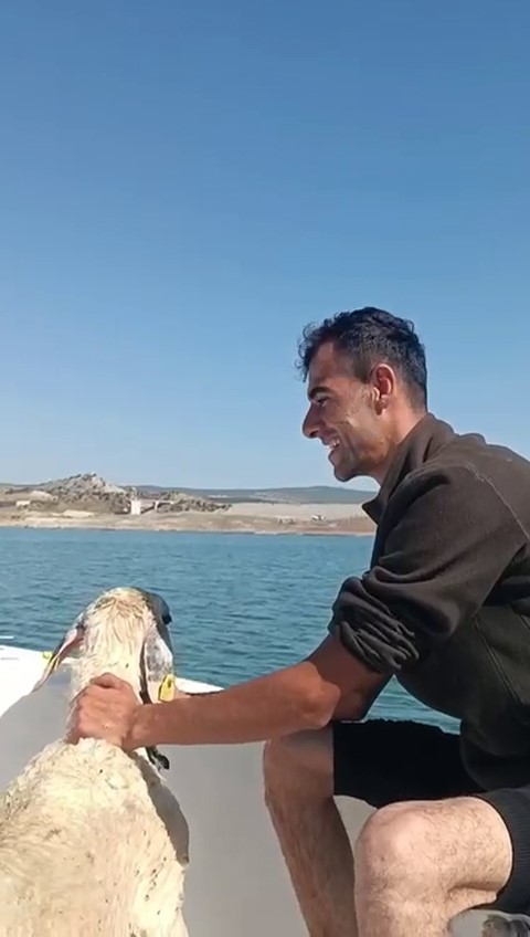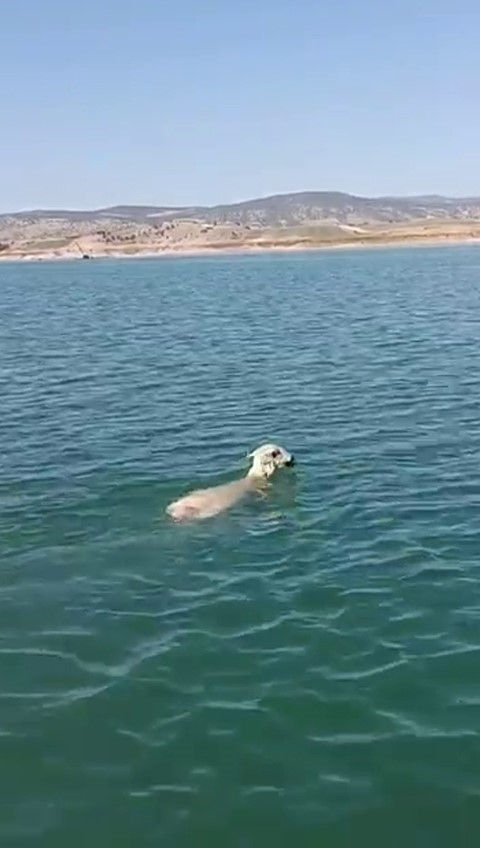 O esnada barajda balık tutan 3 kişi, barajın ortasında yüzen koyunu gördü.