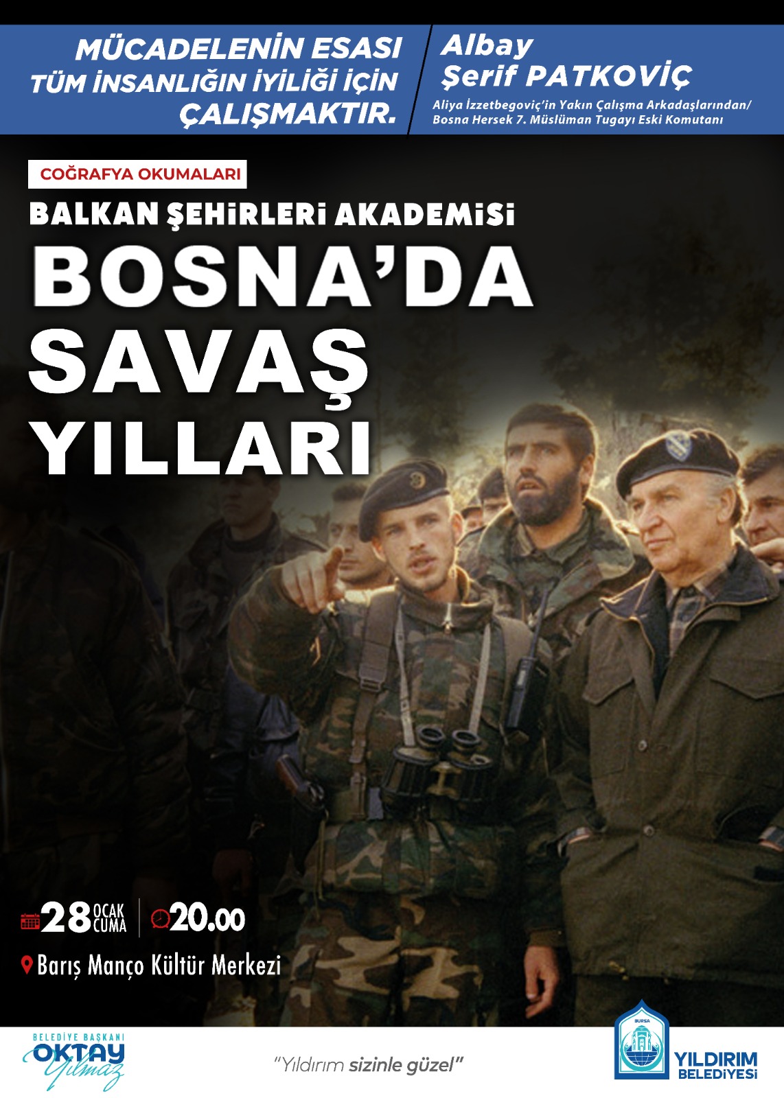 Yıldırım Belediyesi’nin düzenlediği ‘Balkan Şehirleri Akademisi’ başlıyor. 28 Ocak- 11 Mart tarihleri arasında, Barış Manço Kültür Merkezi’nde gerçekleştirilecek coğrafya okumalarının ilk konuğu Bosna- Hersek’in ilk Cumhurbaşkanı Aliya İzzetbegoviç’in subaylarından 7. Müslüman Tugay Komutanı Albay Şerif Patkoviç olacak. Bosna Hersek’in bağımsızlık mücadelesinde Bilge Kral İzzetbegoviç’in en yakınındaki isimlerden olan Patkoviç, Bosna’nın bağımsızlık destanını, Saray Bosna’yı ve Bilgi Kral Aliya’yı anlatacak.