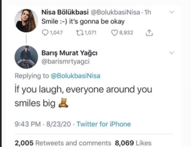 Adı Nisa Bölükbaşı ile aşk dedikodularına karışan Barış Murat Yağcı bu paylaşımı ise es geçmedi. Barış Murat Yağcı verdiği yanıtta “Eğer sen gülersen etrafındaki herkes daha çok güler” dedi.