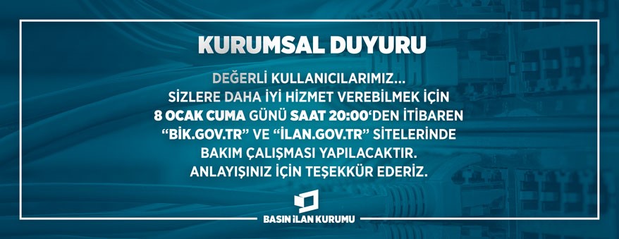 Sizlere daha iyi hizmet verebilmek için 8 Ocak 2021 Cuma günü saat 20:00’den itibaren “bik.gov.tr” ve “ilan.gov.tr” internet sitelerimizde bakım çalışması yapılacaktır.
