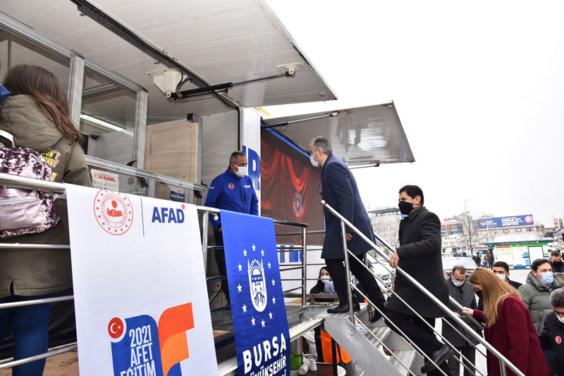 Bursa Büyükşehir Belediyesi, deprem kuşağında bulunan Türkiye’nin birinci derece riskli bölgelerinden biri olan Bursa’da deprem bilincini oluşturmak amacıyla çalışmalarını sürdürüyor. Bu kapsamda Deprem Risk Yönetimi ve Kentsel İyileştirme Dairesi Başkanlığı’nı kurarak Bursa’yı depreme en hazır şehir haline getirmek için yoğun çaba sarf eden Büyükşehir Belediyesi, 1-7 Mart Deprem Haftası etkinlikleri kapsamında Afet ve Acil Durum Yönetimi Başkanlığı’na (AFAD) yaptığı talep doğrultusunda ‘Gezici Deprem Simülasyon Eğitim Tırı’nı Bursa’ya getirtti. Kent Meydanı’nda kurulan simülasyon tırına vatandaşlar yoğun ilgi gösterdi. 1999 Düzce ve İzmit, 2003 Bingöl ve 2011 Van depremlerinin canlandırıldığı tırda, büyük küçük herkes deprem anını yaşadı. Alanda kurulan stantlarda ise AFAD ekipleri ve Büyükşehir Belediyesi ‘Mahalle Gönüllüleri’ tarafından el afişleri, boyama kitapları ve eşya sabitleme aparatı dağıtılarak bilgilendirme yapıldı.