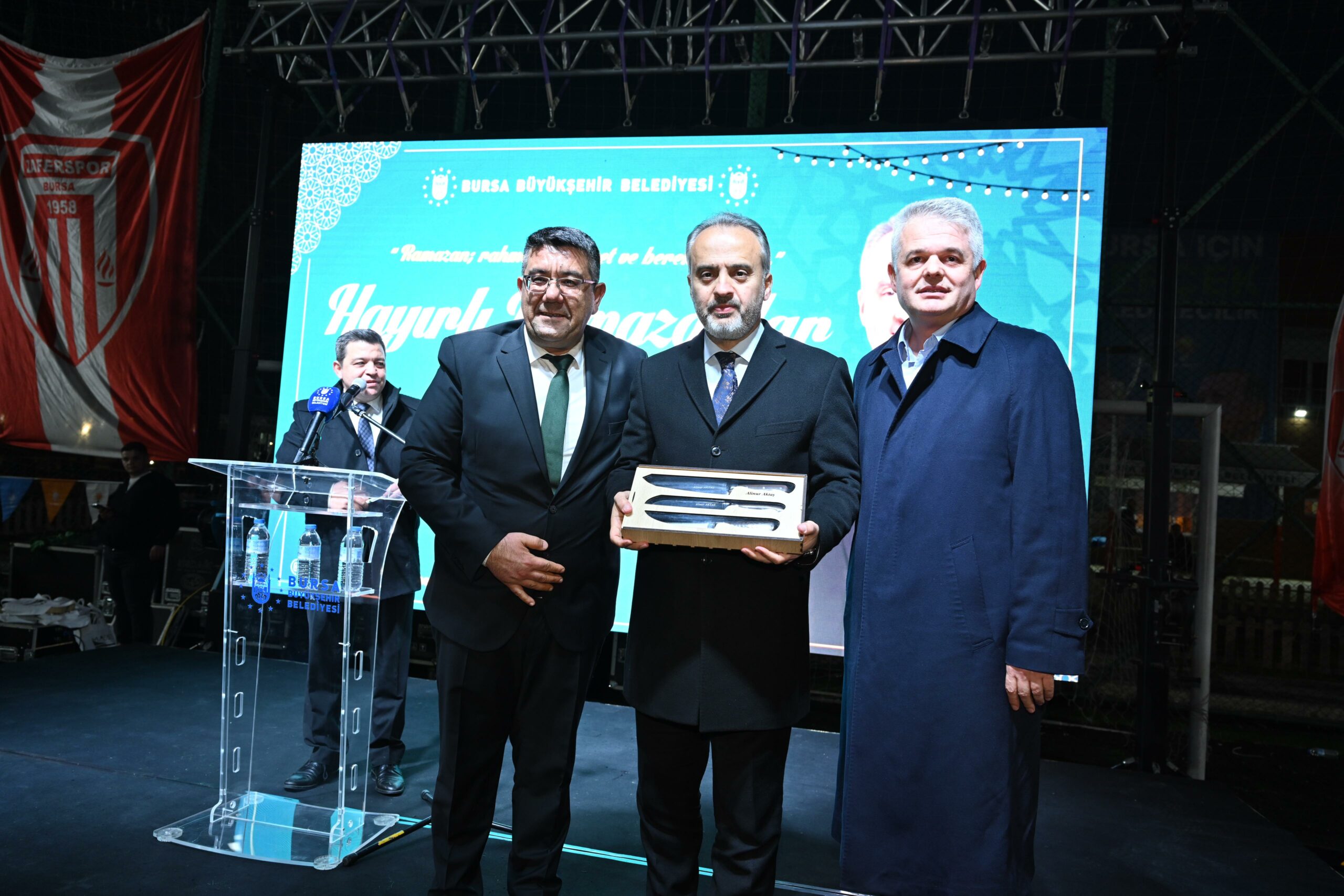 İftar yemeğinin ardından birlik beraberlik mesajlarını yineleyen Başkan Aktaş, ‘’Ben sizlere hizmet eden bir kardeşiniz olarak söylemek istiyorum ki Gökdere düne kadar metruk bir alandı şimdi orada güzel bir parkımız var, ufak tefek eksiklerini tamamladığımızda daha da güzelleşecek. Sağlık ocağımızı da açtık. Pazaryerimizin de yapımı devam ediyor. Yeni dönemde mahallemizi kentsel dönüşümlerle daha da güzelleştireceğiz. Bugüne kadar bize gösterdiğiniz destek ve katkılardan dolayı teşekkür ediyorum. Bizde aldığımız emaneti en iyi şekilde taşımak için elimizden gelen gayreti gösterdik’’ dedi. Amatör spor kulüplerinin taleplerini karşılıksız bırakmadıklarını belirten Başkan Aktaş; “ Zaferspor tesisiyle alakalı bazı yenilemelere ihtiyaç oldu hiç kayıtsız kalmadık, bu noktada mukabele ettik. Bundan sonra da bir eksiklik olduğunda aynı şekilde yerine getireceğimizden şüpheniz olmasın.’’ diye ifade etti. Zaferspor Kulübü Başkanı Şaban Sönmez günün anısına Bursa Büyükşehir Belediye Başkanı Alinur Aktaş’a hediye takdiminde bulunmasının ardından, sadece Zaferspor değil tüm Bursa spor kulüplerine eşit hizmetler verildiğini belirterek teşekkürlerini sundu.